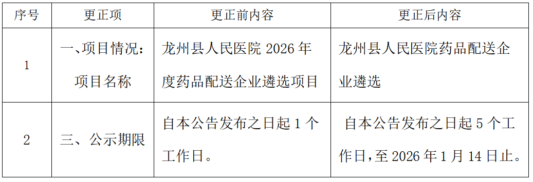 【崇左市龙州县人民医院】广西壮族自治区崇左市龙州县人民医院药品配送企业遴选遴选结果公示(更正)