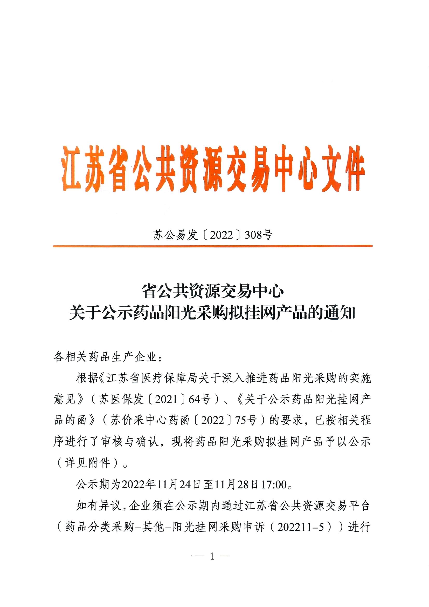 根据《江苏省医疗保障局关于深入推进药品阳光采购的实施意见》(苏医保发〔2021〕64号)、《关于公示药品阳光挂网产品的函》(苏价采中心药函〔2022〕75号)的要求,已按相关程序进行了审核与确认,现将药品阳光采购拟挂网产品予以公示(详见附件)。