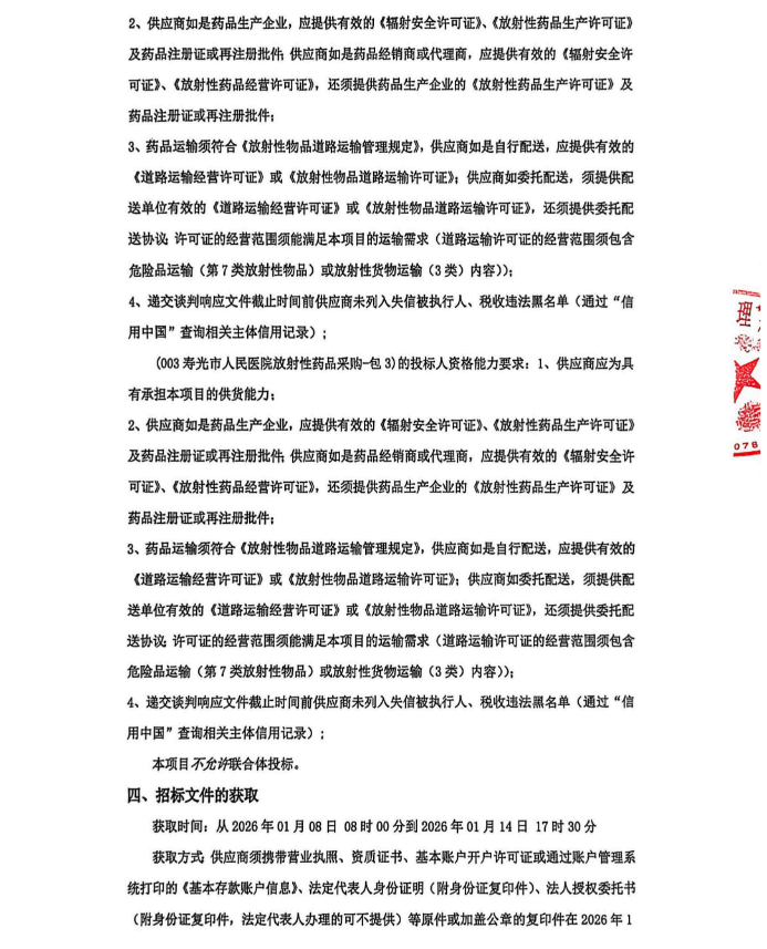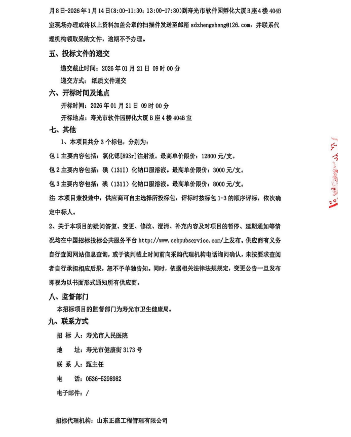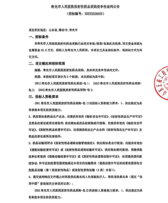 【潍坊市寿光市人民医院】山东省寿光市人民医院放射性药品采购竞争性谈判公告