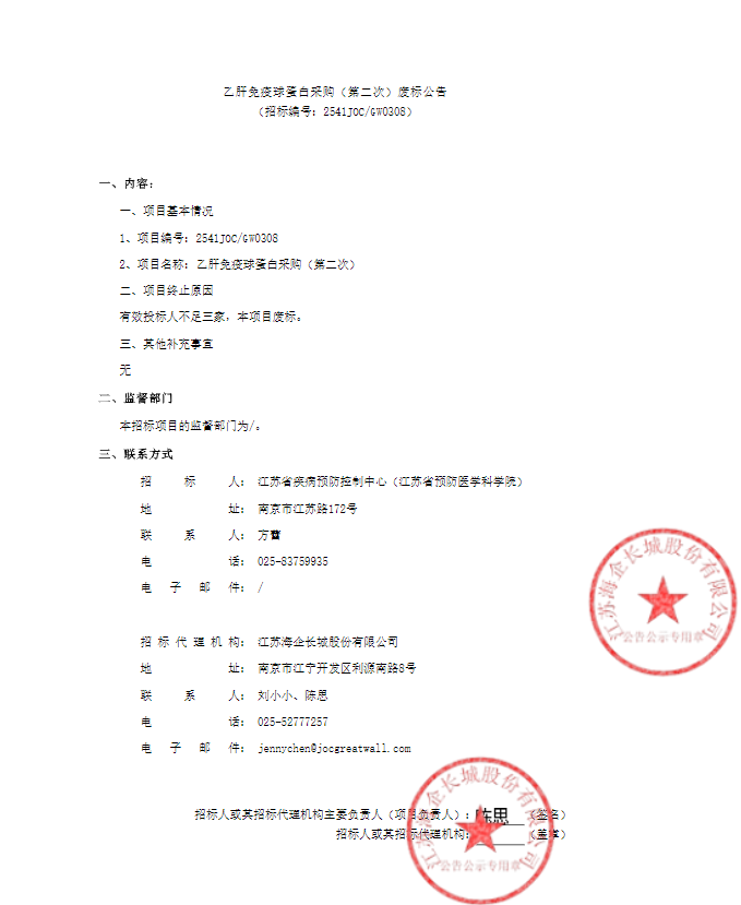 【江苏省疾病预防控制中心】江苏省疾病预防控制中心(江苏省预防医学科学院)乙肝免疫球蛋白采购(第二次)废标公告