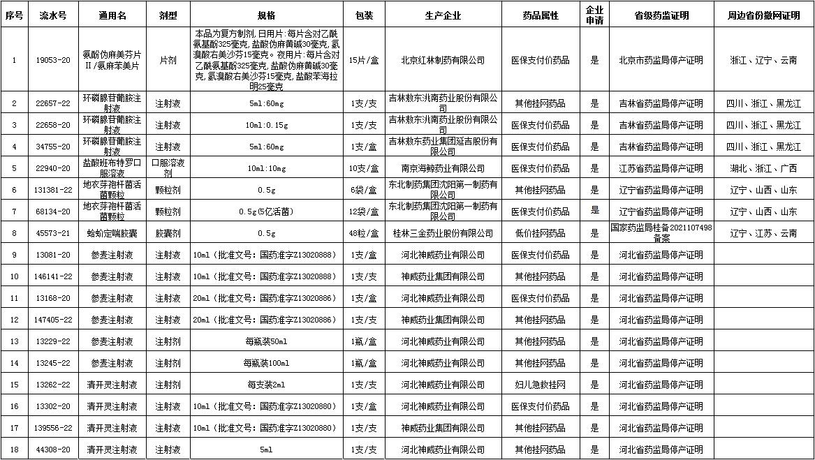 二、因国家政策调整、自然灾害、生产企业技术改造或其他不可抗力原因,导致企业暂时不能供应挂网交易药品的情况,依据省医保局价采工作联席会议决议,可根据相关企业申请、该企业所属地省级药监部门出具的停产证明和周边至少3个省份(自治区、直辖市)药品交易平台撤网证明 ,对相关药品予以暂停交易处理。撤网后,企业原履行的义务和责任不变,该企业生产的同通用名、同剂型、同规格药品不得再次申请挂网。现依据上述要求对有关企业申请合规的相关药品暂停网上交易资格(见下表),请相关医疗机构及时调整药品采购目录。