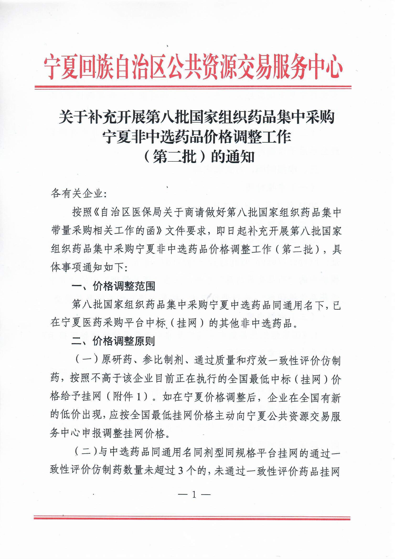 格给予挂网(附件1)。如在宁夏价格调整后,企业在全国有新的低价出现,应按全国最低挂网价格主动向宁夏公共资源交易服务中心申报调整挂网价格。