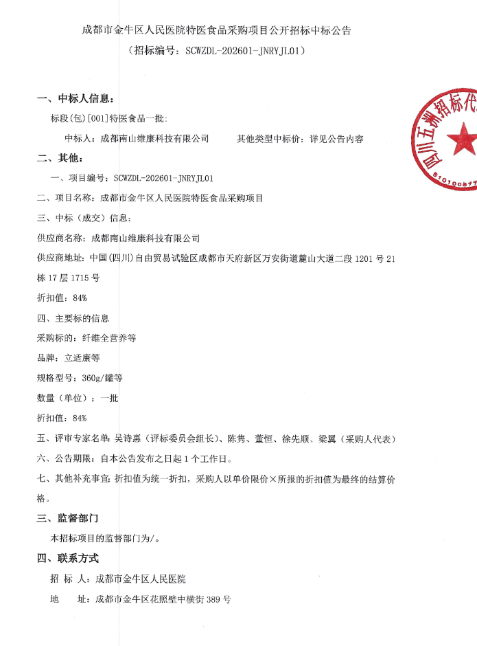 【成都市金牛区人民医院】四川省成都市金牛区人民医院特医食品采购项目公开招标中标公告