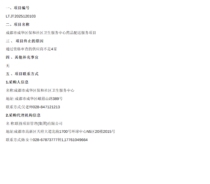 【成都市成华区保和社区卫生服务中心】四川省成都市成华区保和社区卫生服务中心药品配送服务项目公开招标废标公告