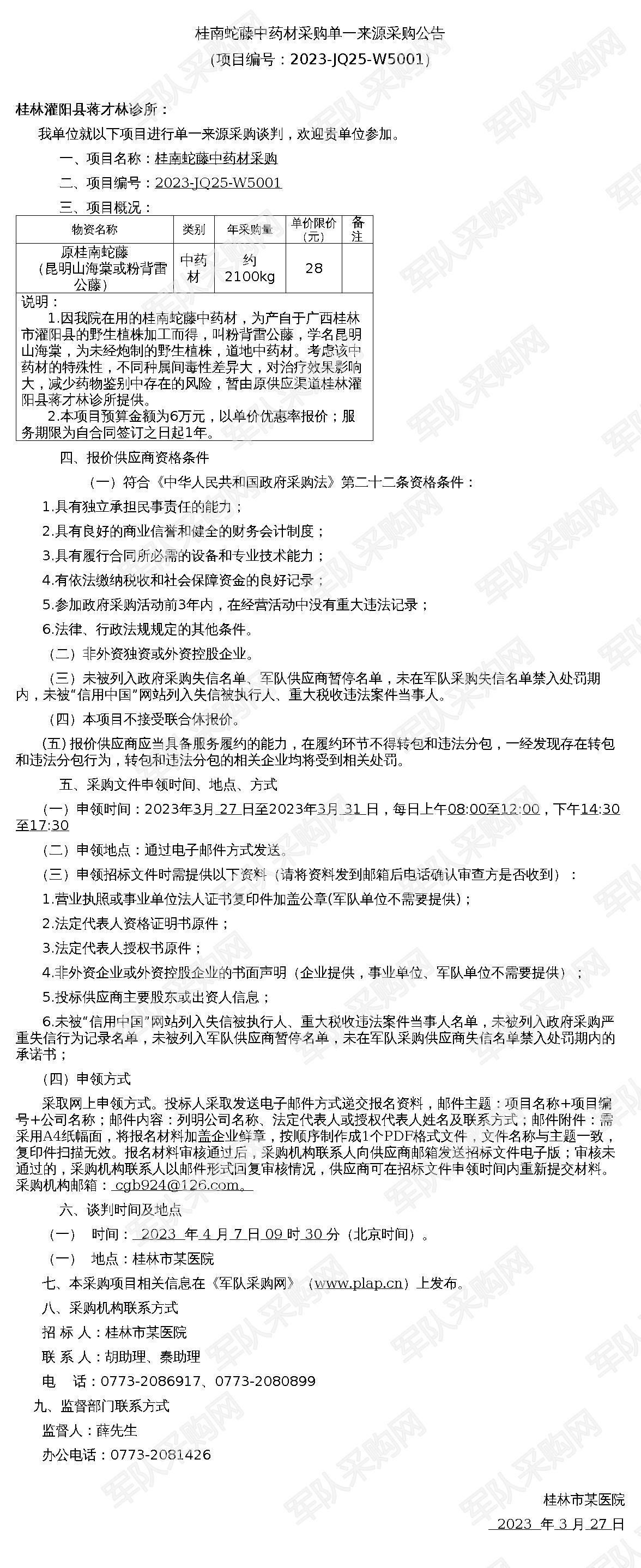 【军队采购】军队采购网桂南蛇藤中药材采购单一来源采购公告(2023-JQ25-W5001)