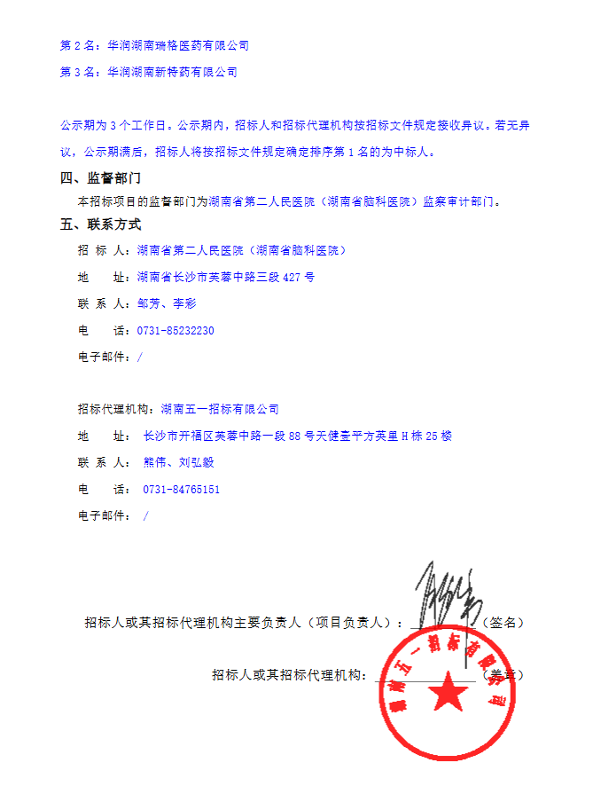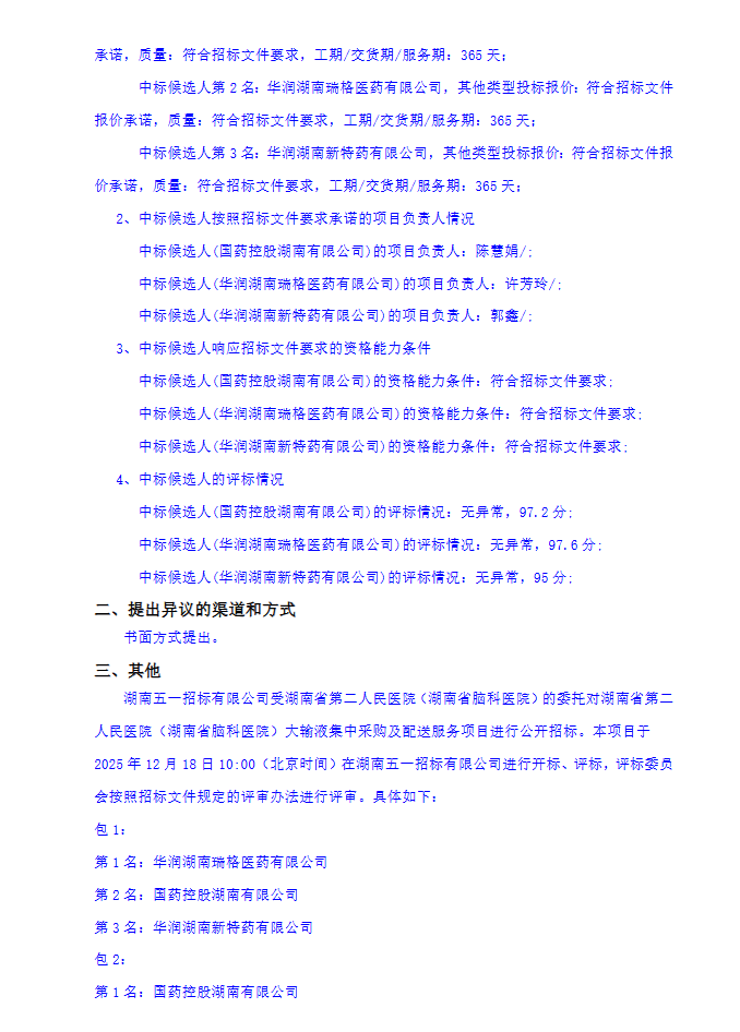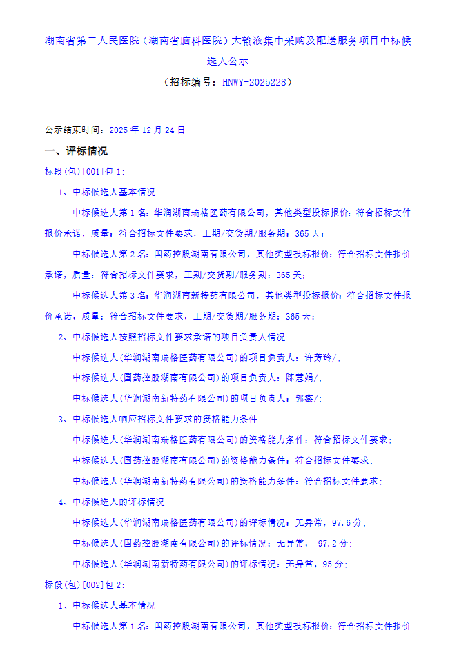 【湖南省第二人民医院】湖南省第二人民医院(湖南省脑科医院)大输液集中采购及配送服务项目中标候选人公示
