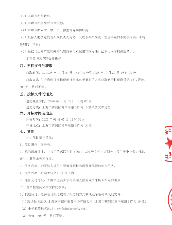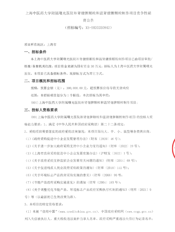 【上海中医药大学附属曙光医院】上海市上海中医药大学附属曙光医院补肾健脾颗粒和温肾健脾颗粒制作项目竞争性磋商公告