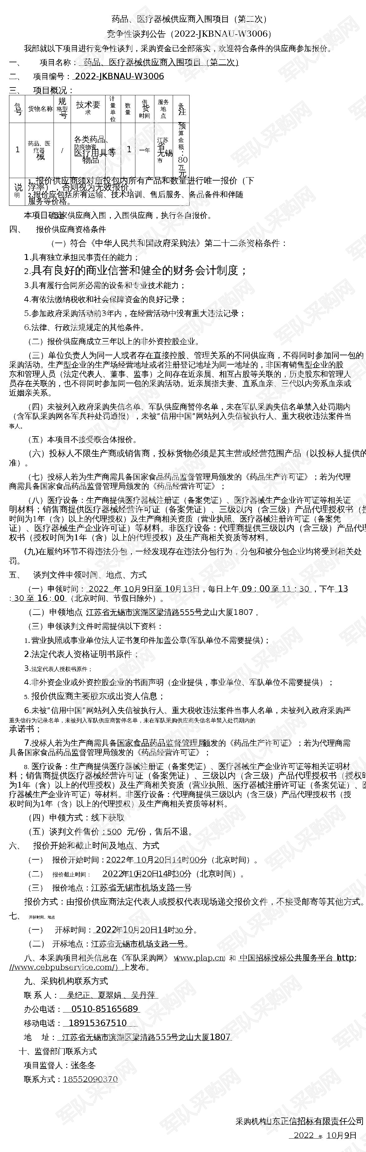 【军队采购网】药品、医疗器械供应商入围项目(第二次)竞争性谈判公告(2022-JKBNAU-W3006)