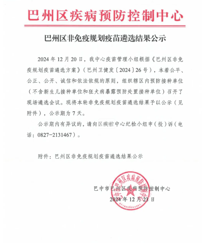 【巴中】巴州区非免疫规划疫苗遴选结果公示