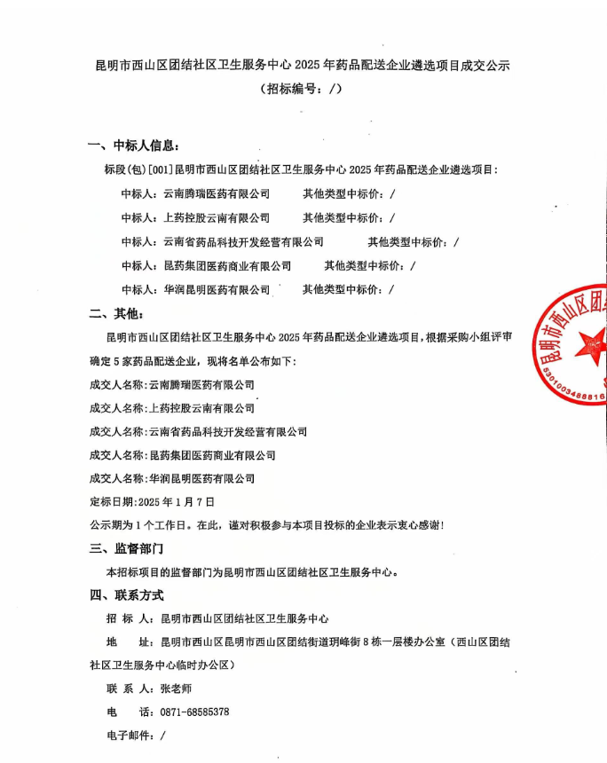 【昆明市西山区团结社区卫生服务中心】云南省昆明市西山区团结社区卫生服务中心2025年药品配送企业遴选项目成交公示