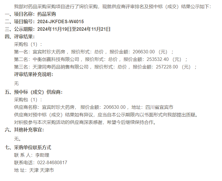 【军队采购】军队采购网药品采购采购结果公示(2024-JKFDES-W4015)