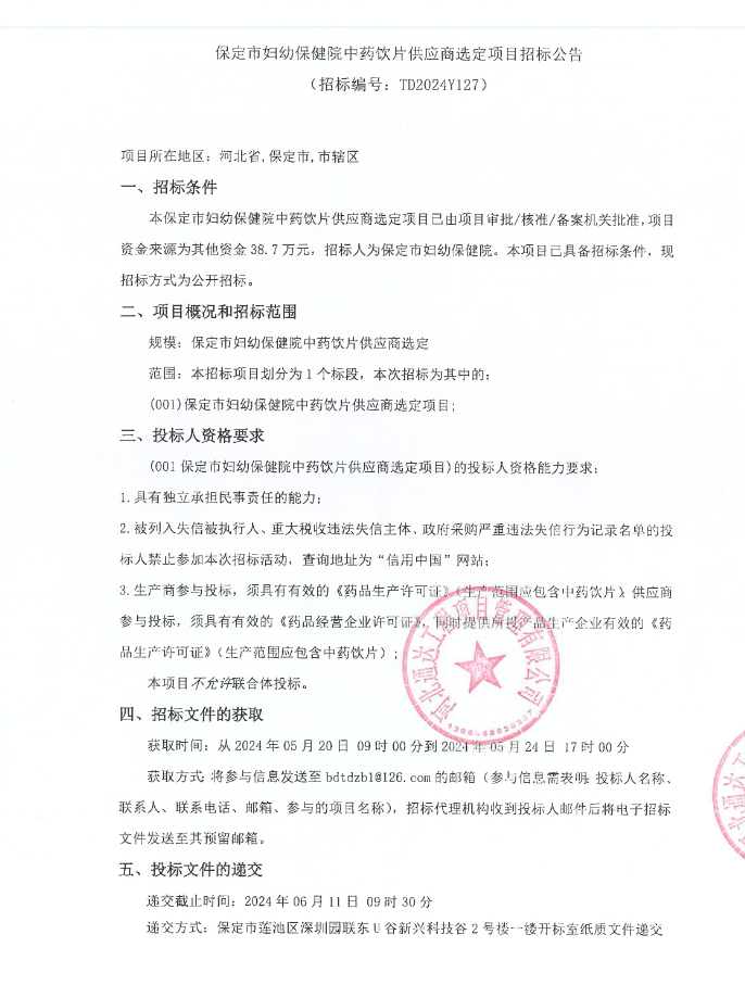 【保定市妇幼保健院】河北省保定市妇幼保健院中药饮片供应商选定项目招标公告