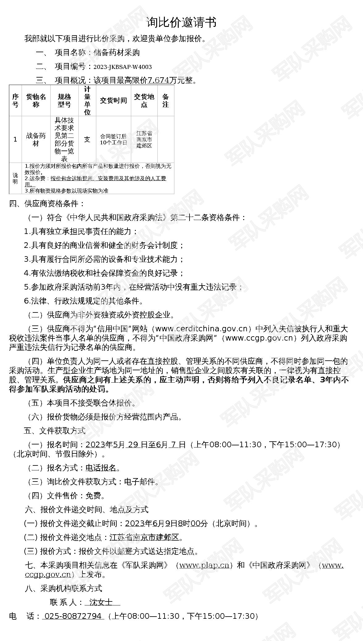 【军队采购】军队采购网储备药材采购询比价公告(2023-JKBSAP-W4003)