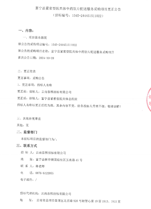 【文山壮族苗族自治州富宁县紧密型医共体】云南省文山壮族苗族自治州富宁县紧密型医共体中药饮片配送服务采购项目更正公告