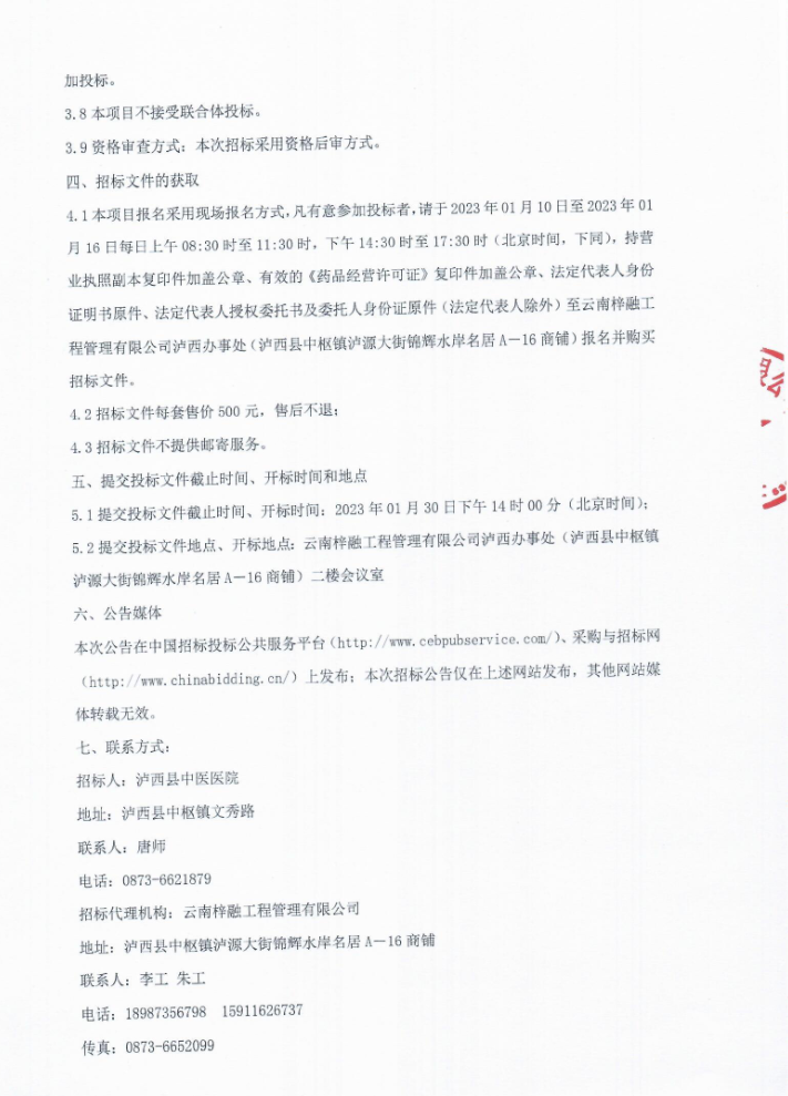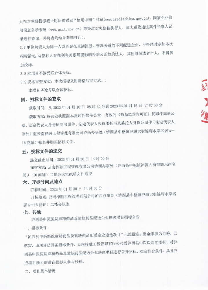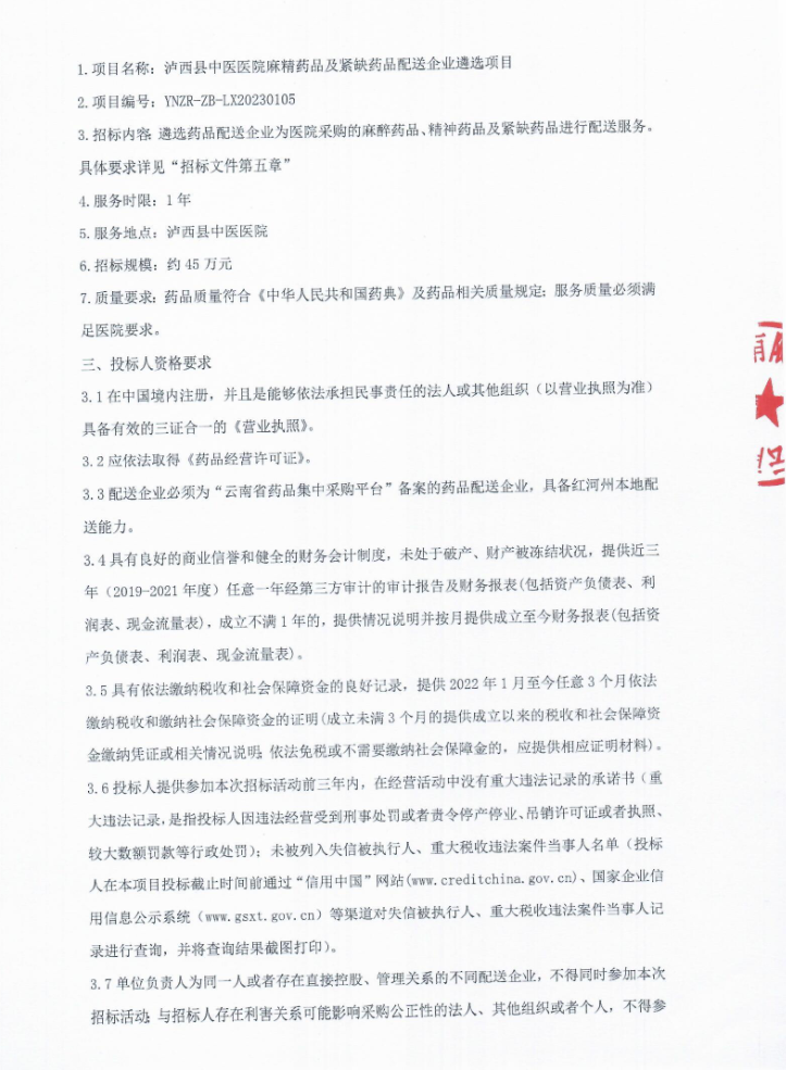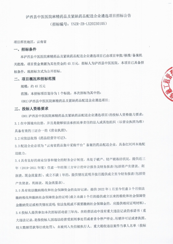 【红河哈尼族彝族自治州泸西县中医医院】云南省红河哈尼族彝族自治州泸西县中医医院麻精药品及紧缺药品配送企业遴选项目招标公告