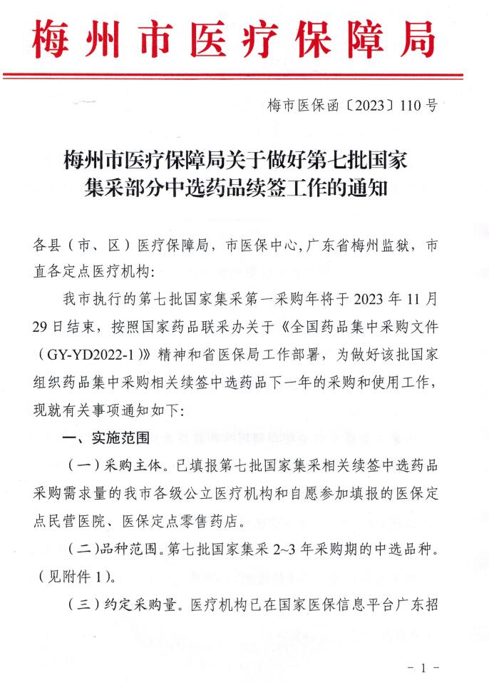 【梅州】梅州市医疗保障局关于做好第七批国家集采部分中选药品续签工作的通知