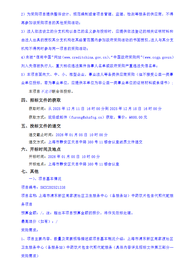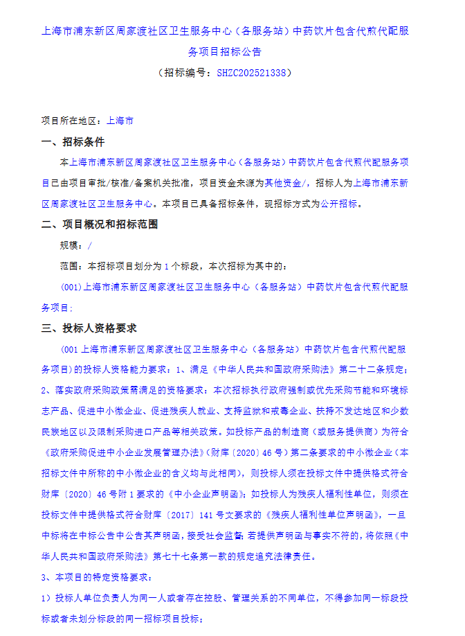 【上海市浦东新区周家渡社区卫生服务中心】上海市浦东新区周家渡社区卫生服务中心(各服务站)中药饮片包含代煎代配服务项目招标公告