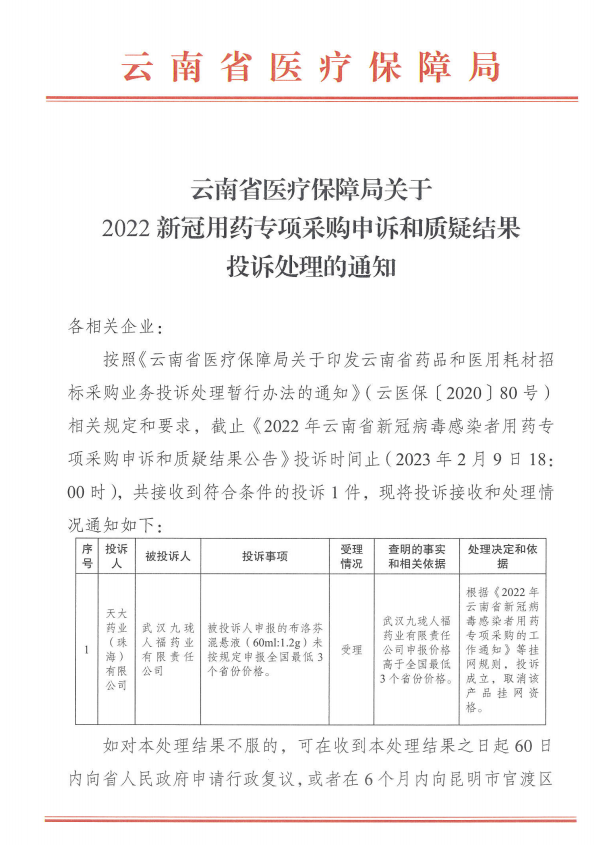 按照《云南省医疗保障局关于印发云南省药品和医用耗材招标采购业务投诉处理暂行办法的通知》(云医保〔2020〕80号)相关规定和要求,截止《2022年云南省新冠病毒感染者用药专项采购申诉和质疑结果公告》投诉时间止(2023年2月9日18:00时),共接收到符合条件的投诉1件,现将投诉接收和处理情况通知如下: