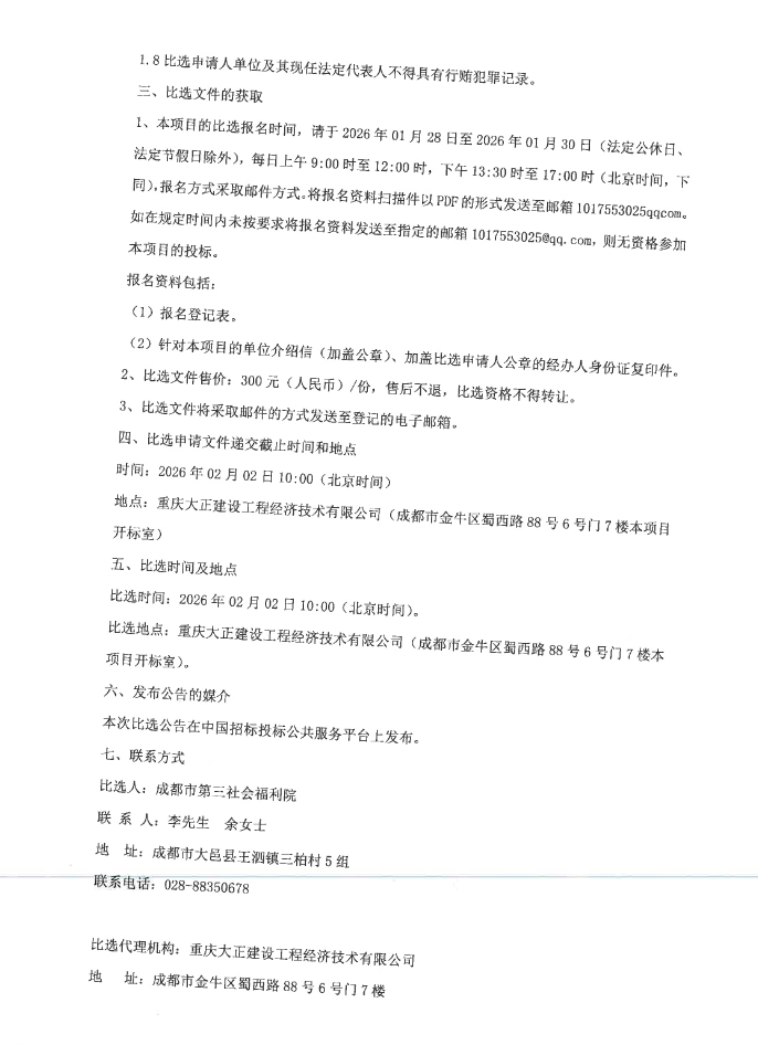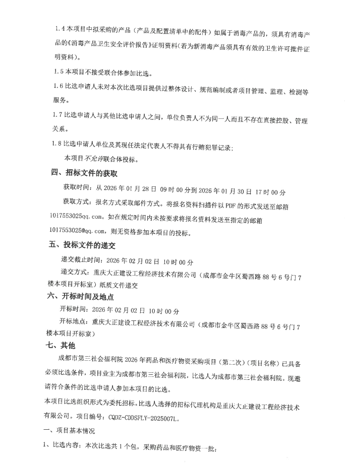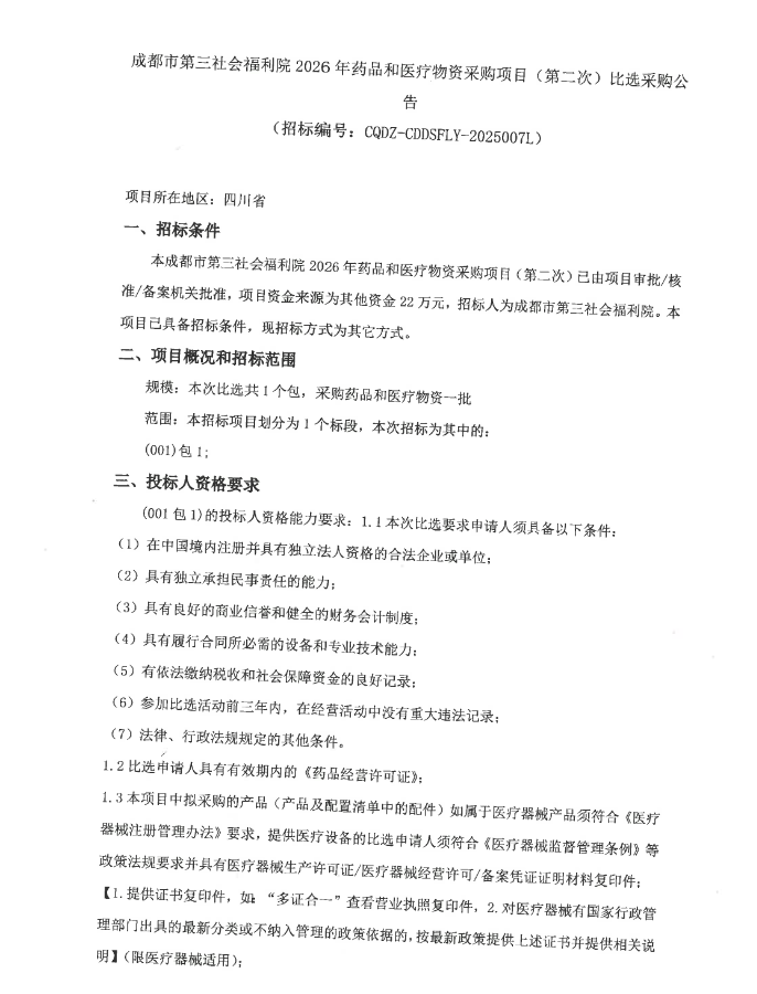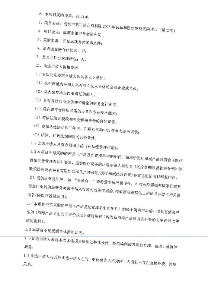 【成都市第三社会福利院】四川省成都市第三社会福利院2026年药品和医疗物资采购项目(第二次)比选采购公告
