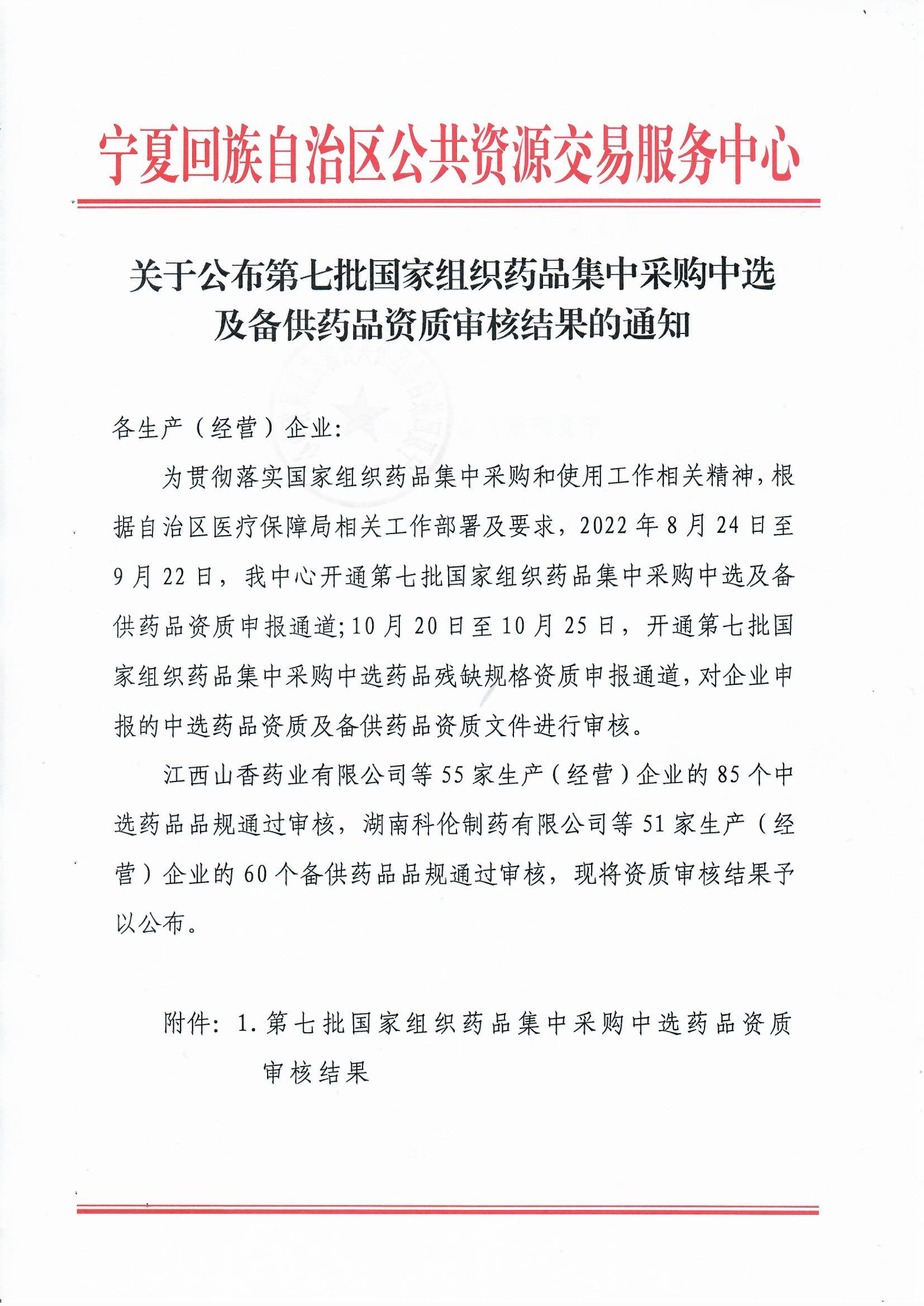附件∶1.第七批国家组织药品集中采购中选药品资质审核结果