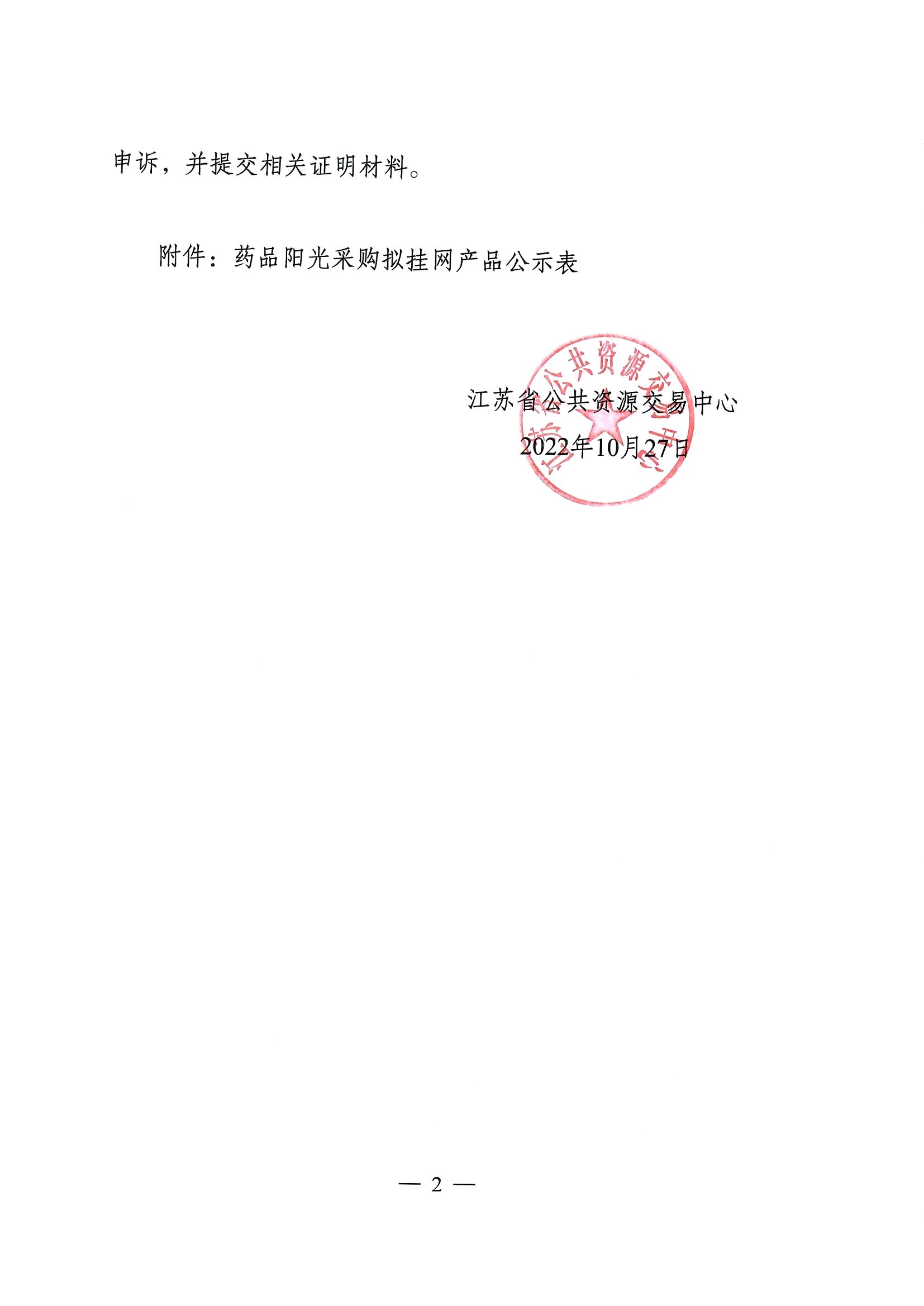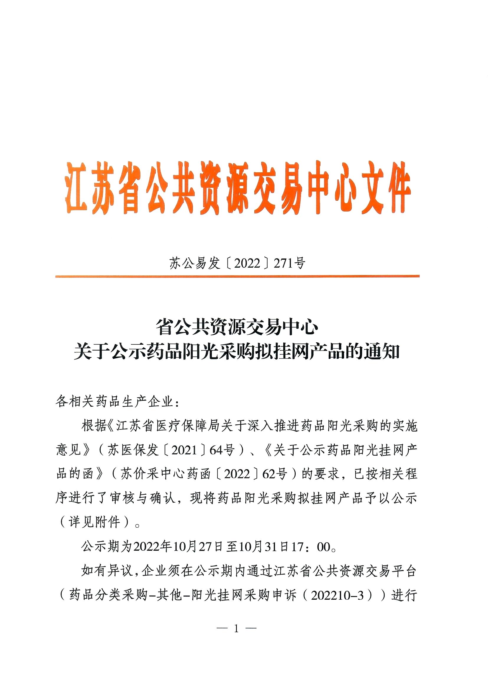 【江苏】江苏省省公共资源交易中心关于公示药品阳光采购拟挂网产品的通知(苏公易发〔2022〕271号)