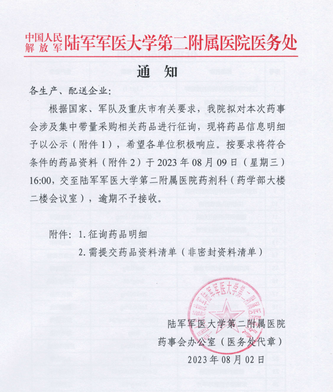 【陆军军医大学第二附属医院】重庆市市辖区沙坪坝区陆军军医大学第二附属医院2023年第2次药事会集采药品配送企业征询通知