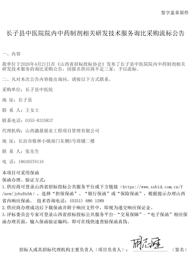 【长治市长子县中医院】山西省长治市长子县中医院院内中药制剂相关研发技术服务询比采购流标公告