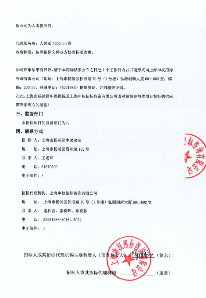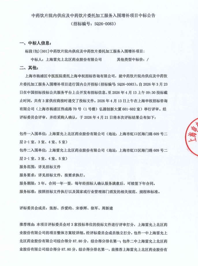 【上海市杨浦区中医医院】上海市杨浦区中医医院中药饮片院内供应及中药饮片委托加工服务入围增补项目中标公告