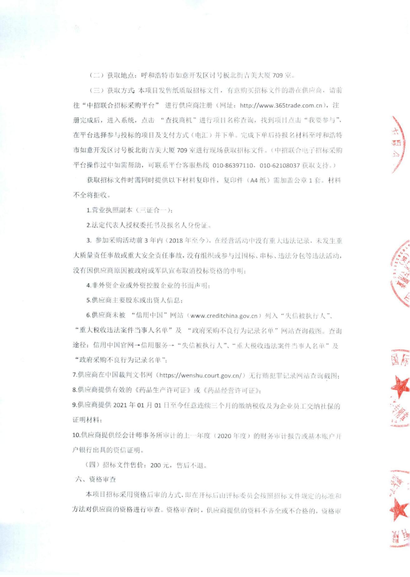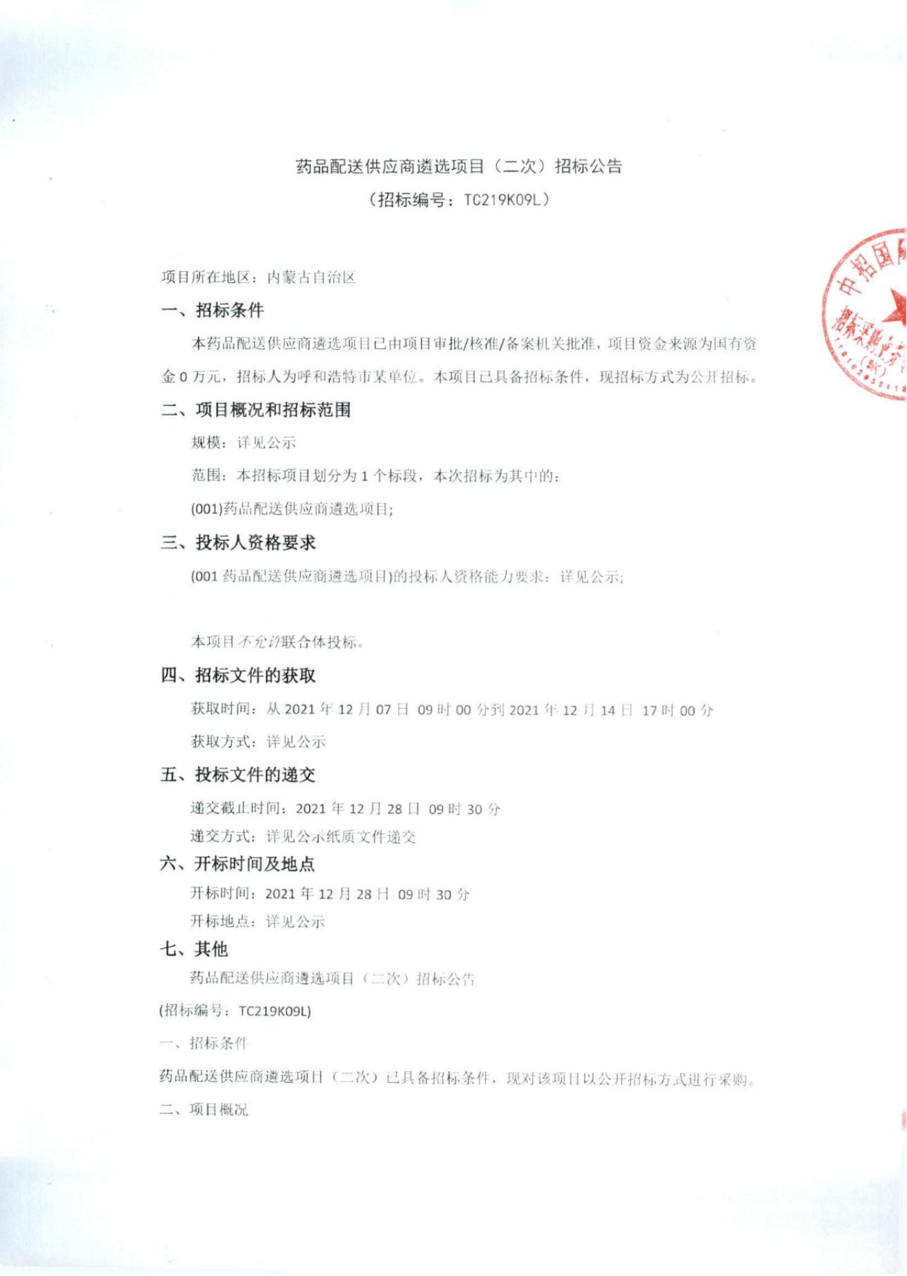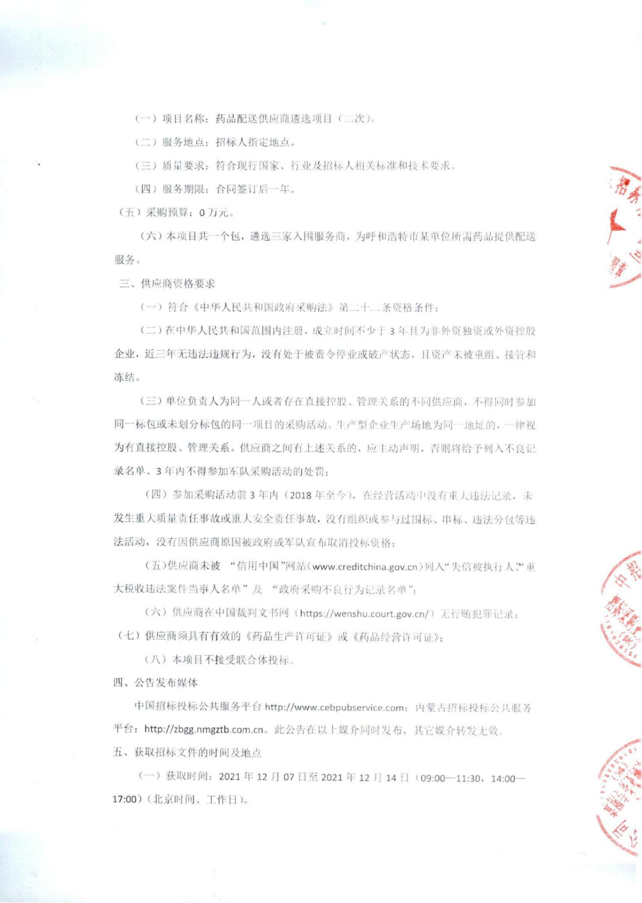 【内蒙】内蒙古自治区药品配送供应商遴选项目(二次)招标公告