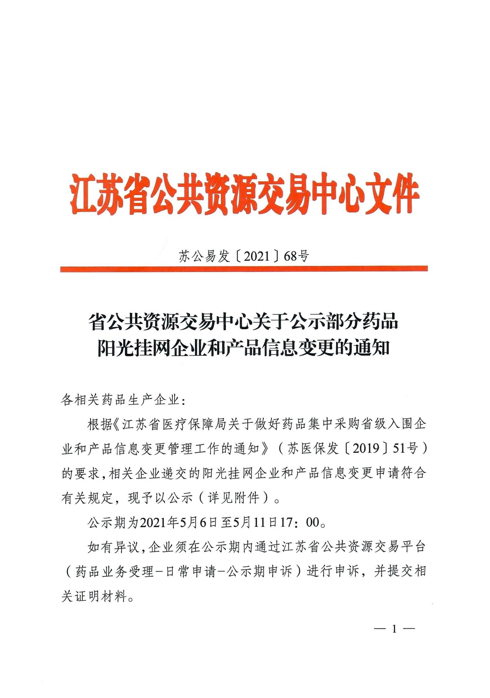 【江苏】2021年江苏省公共资源交易中心关于公示部分药品阳光挂网企业和产品信息变更的通知 苏公易发[2021]68号
