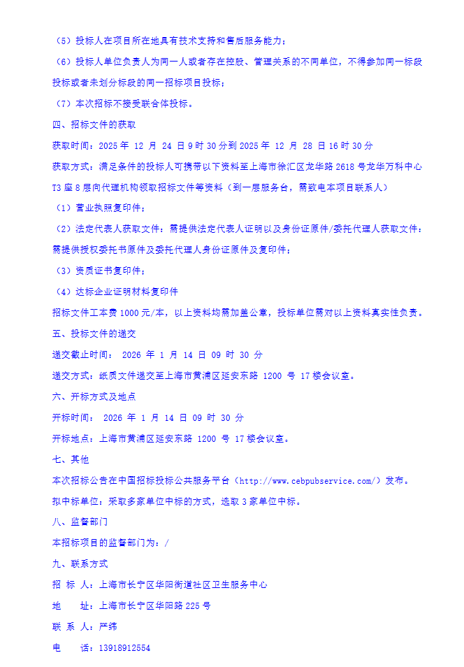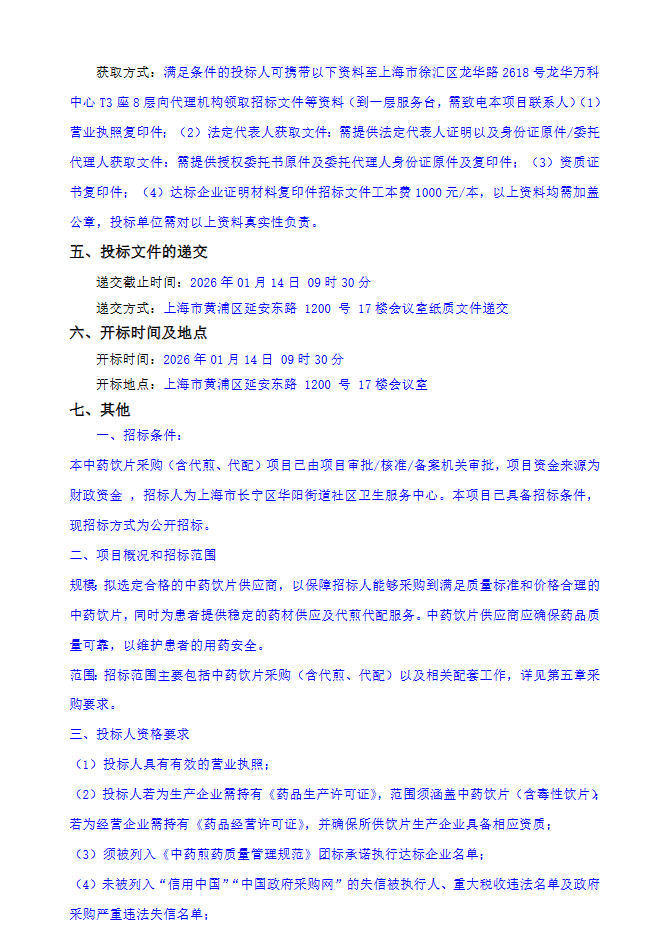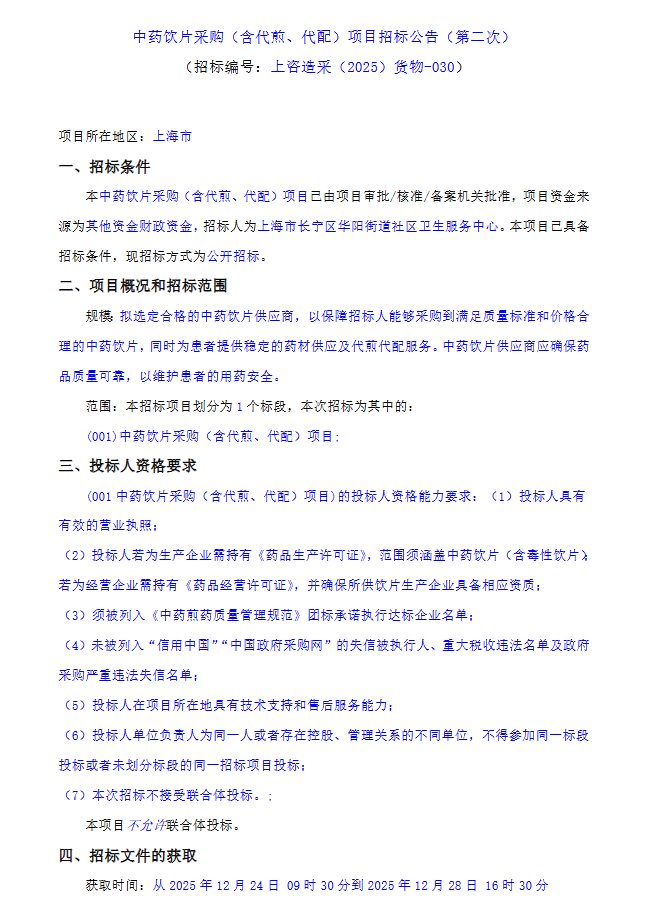 【上海市长宁区华阳街道社区卫生服务中心】上海市长宁区华阳街道社区卫生服务中心中药饮片采购(含代煎、代配)项目招标公告(第二次)