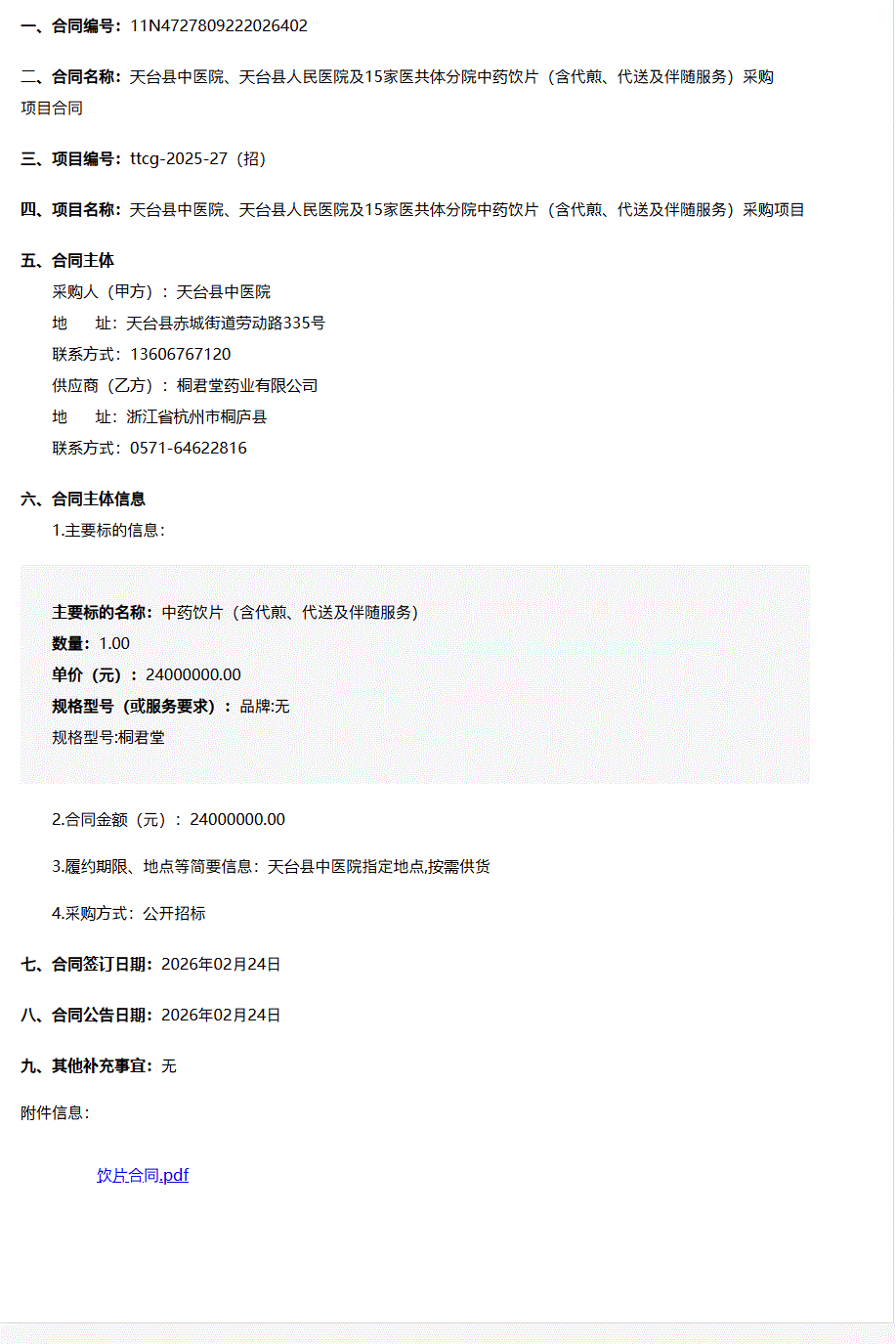 【台州市天台县人民医院】浙江省台州市天台县中医院、天台县人民医院及15家医共体分院中药饮片(含代煎、代送及伴随服务)采购项目合同公告1
