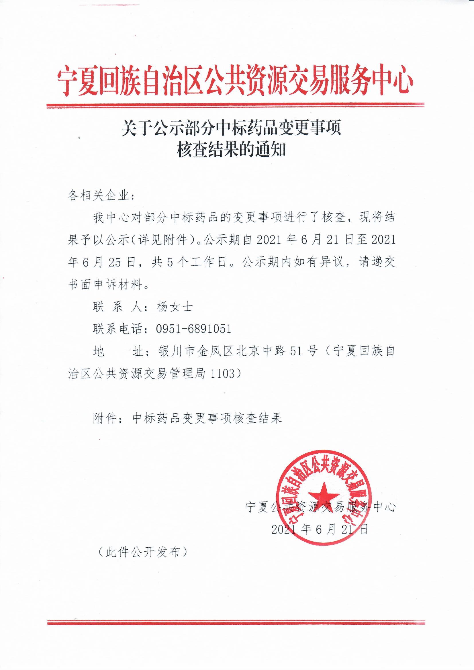 【宁夏】2021年宁夏自治区关于公示部分中标药品变更事项核查结果的通知
