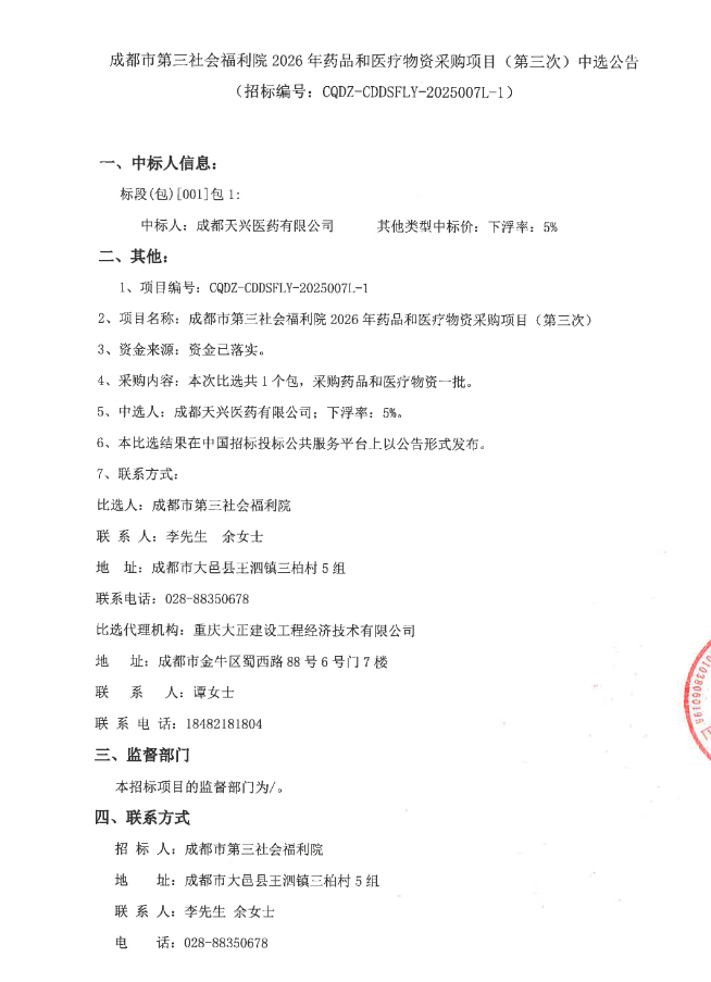 【成都市第三社会福利院】四川省成都市第三社会福利院2026年药品和医疗物资采购项目(第三次)中选公告