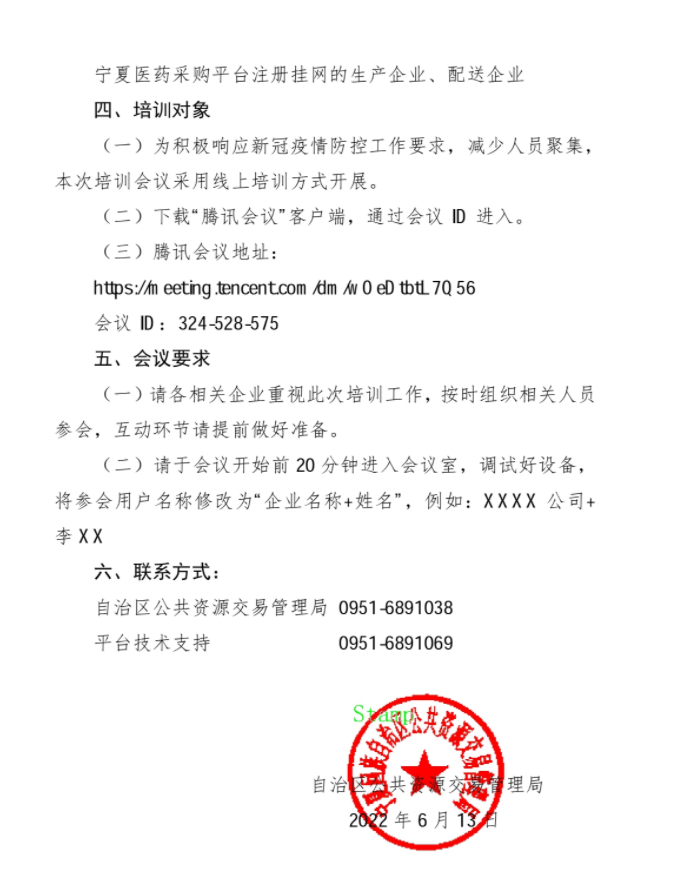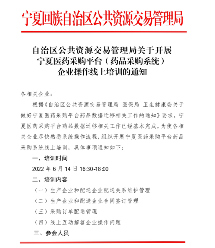 【宁夏】自治区公共资源交易管理局关于开展宁夏医药采购平台(药品采购系统)企业操作线上培训的通知