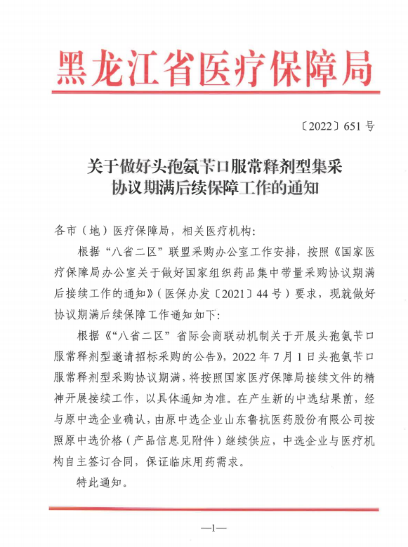 【黑龙江】黑龙江省关于做好头孢氨苄口服常释剂型集采协议期满后续保障工作的通知