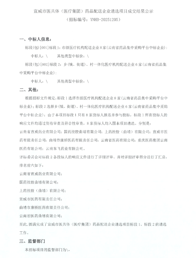 【曲靖市宣威市第一人民医院】云南省宣威市医共体(医疗集团)药品配送企业遴选项目成交结果公示
