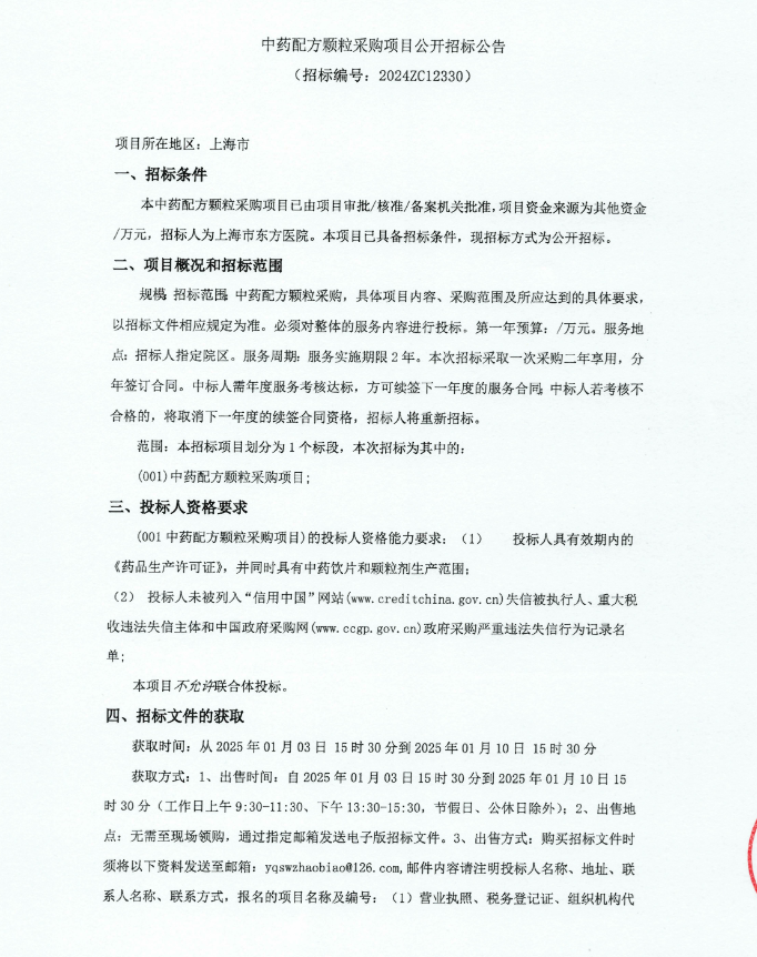【上海市东方医院】上海市东方医院中药配方颗粒采购项目公开招标公告