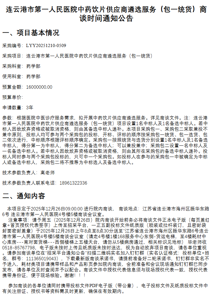 【连云港市第一人民医院】江苏省连云港市第一人民医院中药饮片供应商遴选服务(包一统货)商谈公告