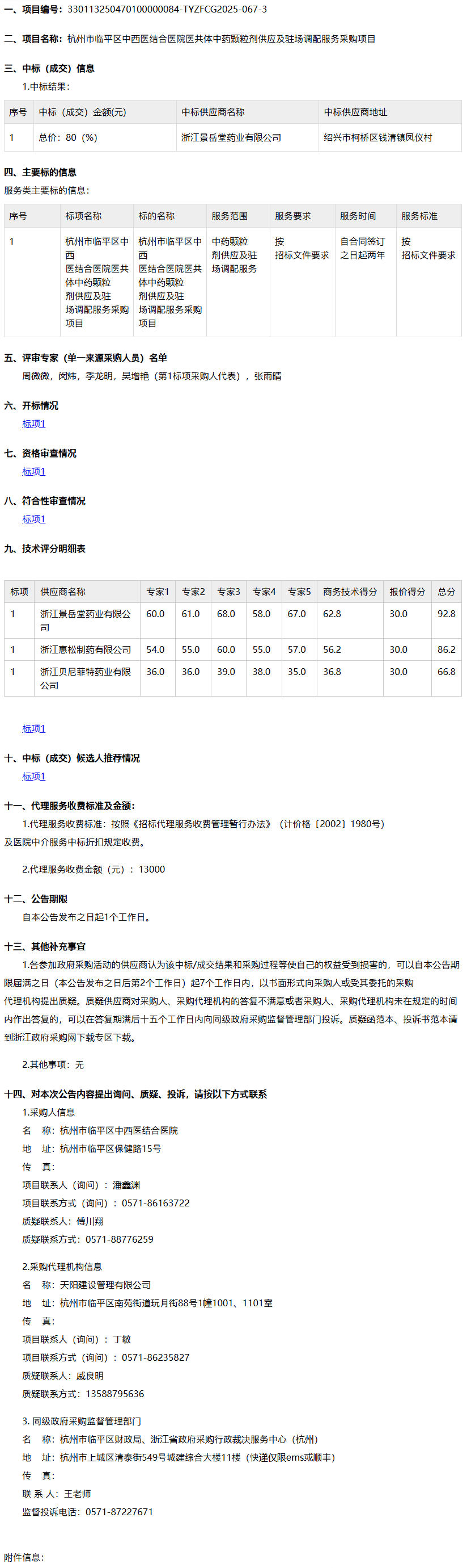 【杭州市临平区中西医结合医院】浙江省天阳建设管理有限公司关于杭州市临平区中西医结合医院医共体中药颗粒剂供应及驻场调配服务采购项目中标(成交)结果公告