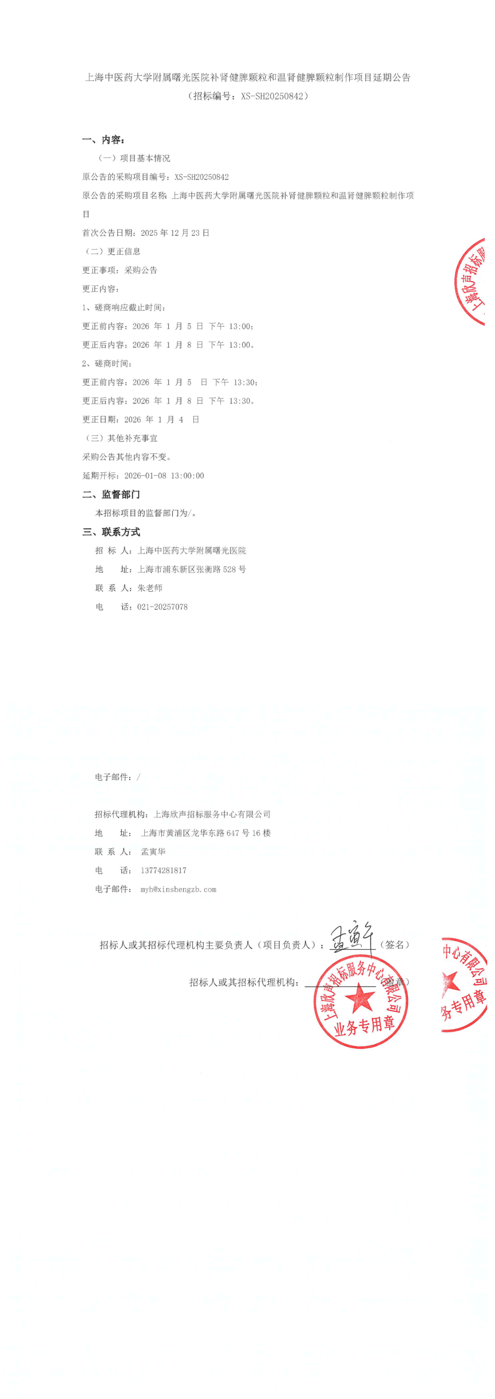 【上海中医药大学附属曙光医院】上海中医药大学附属曙光医院补肾健脾颗粒和温肾健脾颗粒制作项目延期公告