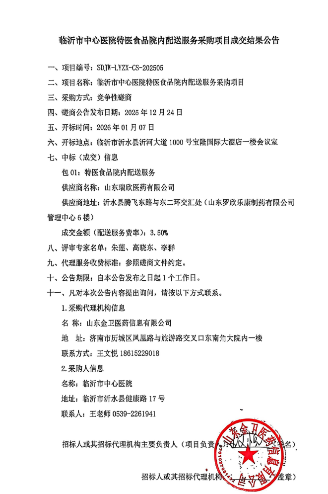 【临沂市中心医院】山东省临沂市中心医院特医食品院内配送服务采购项目成交结果公告