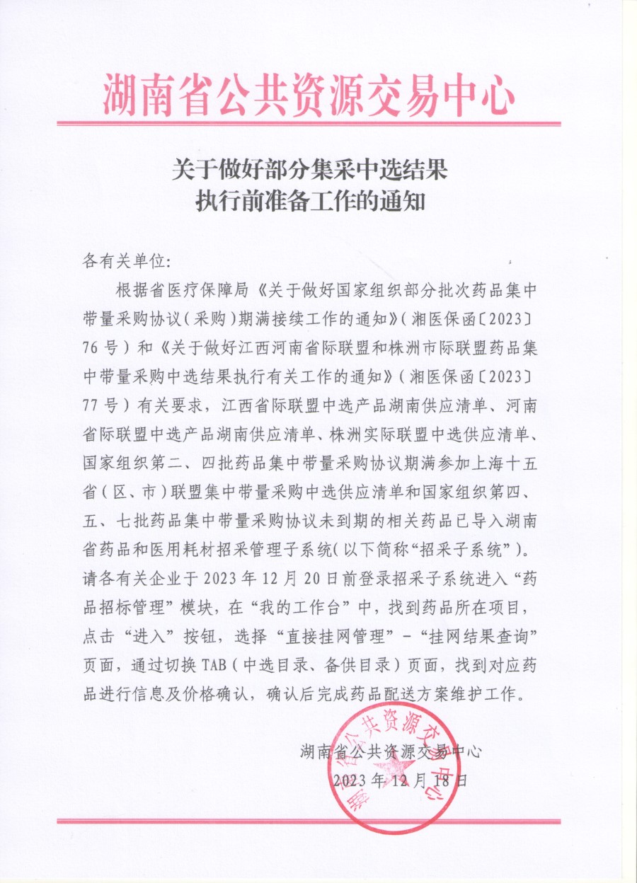 【湖南】湖南省关于做好部分集采中选结果执行前准备工作的通知