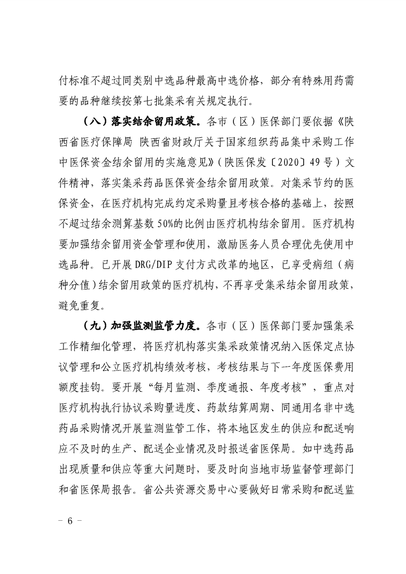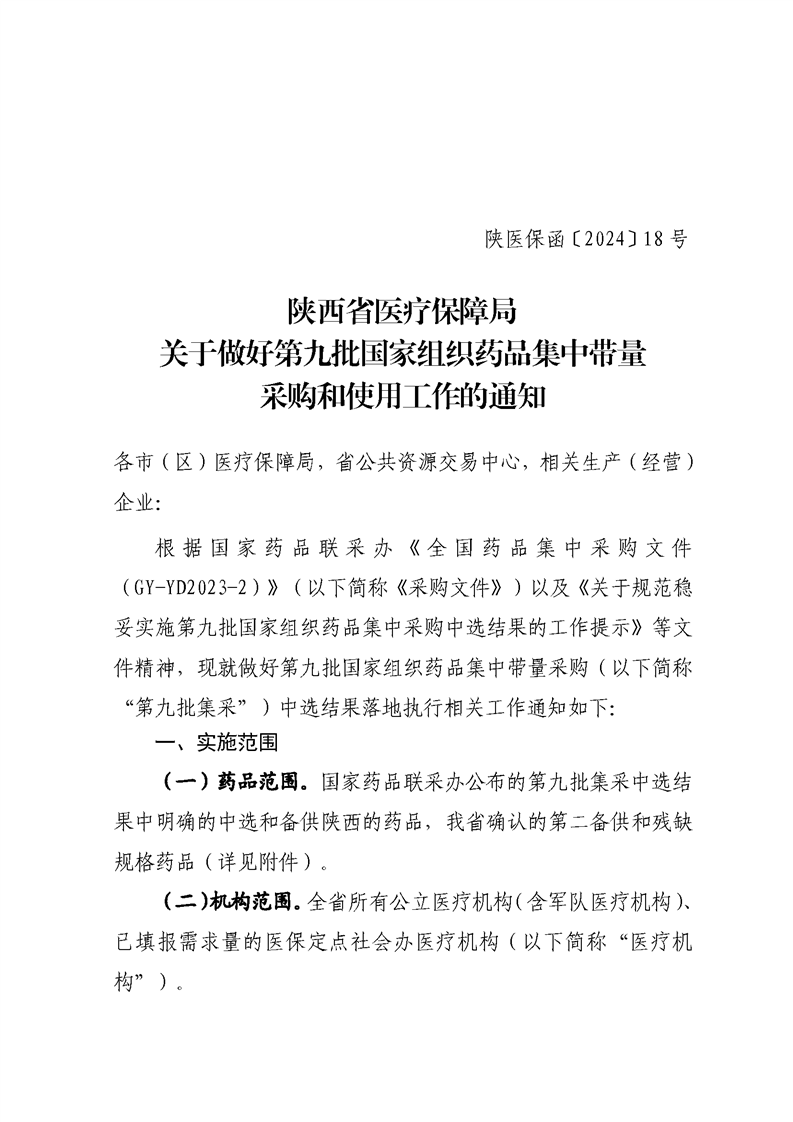 【陕西】陕西省医疗保障局关于做好第九批国家组织药品集中带量采购和使用工作的通知
