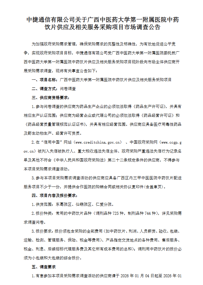 【广西中医药大学第一附属医院】广西壮族自治区中捷通信有限公司关于广西中医药大学第一附属医院中药饮片供应及相关服务采购项目市场调查公告