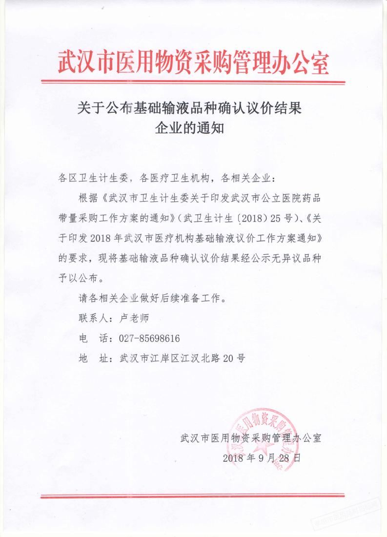 【武汉】湖北省武汉市医用物资采购管理办公室关于公布基础输液品种确认议价结果企业的通知