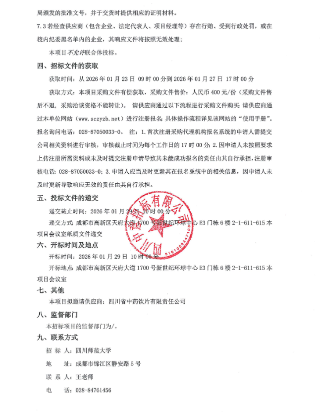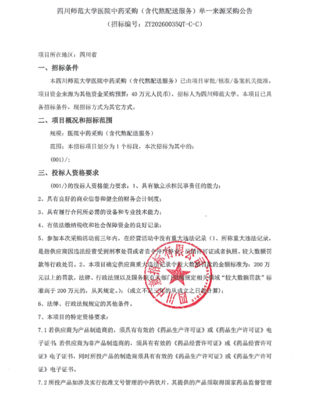 【四川师范大学医院】四川师范大学医院中药采购(含代熬配送服务)单一来源采购公告