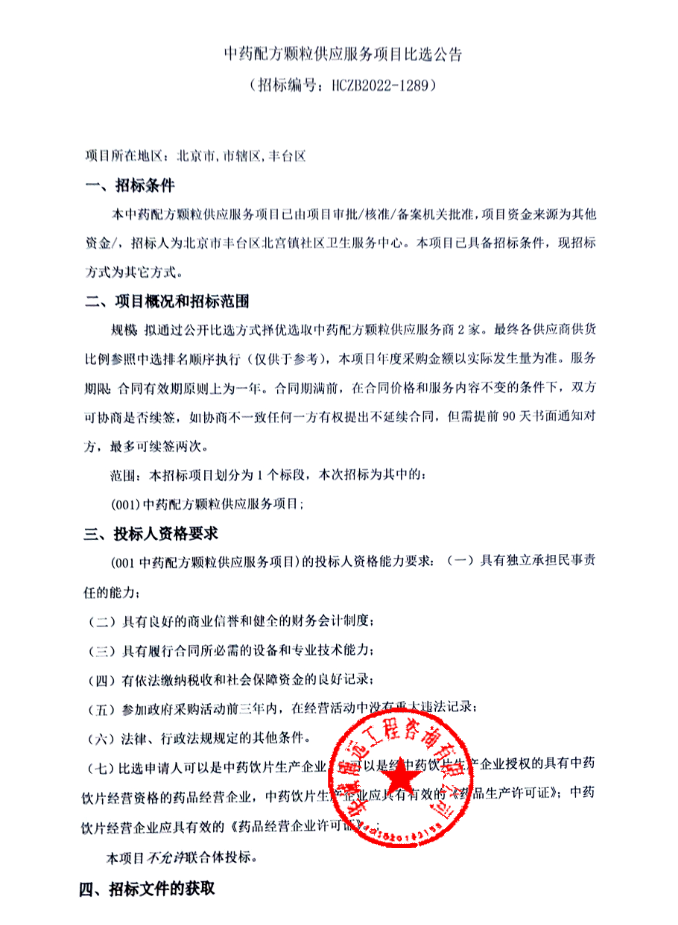 【北京市丰台区北宮镇社区卫生服务中心】北京市丰台区北宮镇社区卫生服务中心中药配方颗粒供应服务项目比选公告