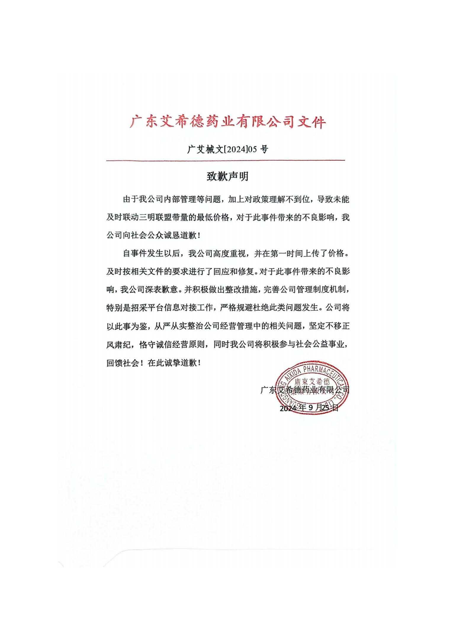 【河南】广东艾希德药业有限公司致歉函