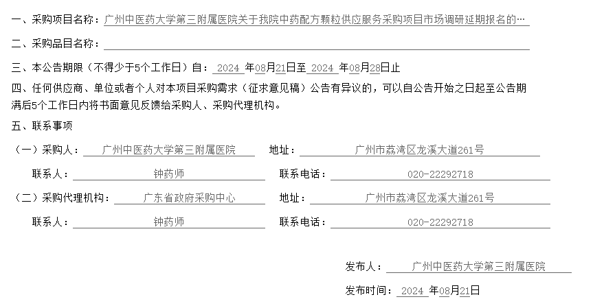 【广州中医药大学第三附属医院】广东省广州中医药大学第三附属医院关于我院中药配方颗粒供应服务采购项目市场调研延期报名的公告采购需求征求意见公告